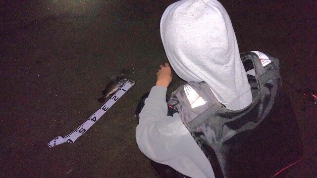 前回のポイントへ移動しファーストヒットは私の5投目にして夜光エギに換えた1投目。